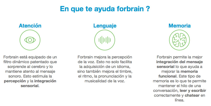 Conocer es tener un conjunto de experiencias y/o memorias internas o externas de imágenes, sonidos y sensaciones percibidas en el pasado y que se atan entre sí para tener un significado. Las competencias cognitivas son habilidades cerebrales necesarias para realizar cualquier tarea, desde la más simple, hasta la más compleja. Se relacionan con los mecanismos de aprendizaje, memoria, resolución de problemas y atención. Las bases neurofisiológicas de la tecnología Forbrain® han captado el interés del Dr. Carles Escera, Catedrático de Neurociencia Cognitiva de la universidad de Barcelona. Gran referente internacional en procesamiento auditivo, voz y cerebro que afirma «El celebro debe aprender a hacer frente y filtrar las variaciones aleatorias producidas en el filtro dinámico de Forbrain®, lo cual produce un efecto de entrenamiento para los mecanismos de control de la atención.»